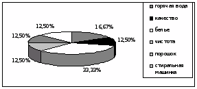Респондентам предлагалось назвать словесную асоциацию на слова «стирка» и «стиральная машина». На слово «стирка» наибольшее число респондентов – 33,33% высказали ассоциацию «белье», 16,67% респондентов «стирку» ассоциируют с горячей водой, и по 12,5% приходится на такие ассоциации, как качество, чистота, порошок, стиральная машинка. Диаграмма ассоциаций со словом «стирка» представлена на Рисунке 6.