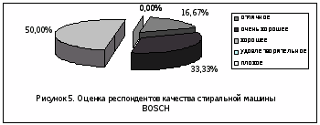 Анализ данных по оценке респондентами качества стиральных машин BOSCH показал, что только 16,67% из них считают качество товара отличным, 33,33% респондентов – очень хорошим и 50% - хорошим.