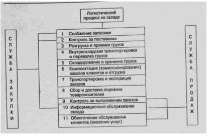 Логистический процесс на складе весьма сложен, поскольку требует полной согласованности функций снабжения запасами, переработки груза и физического распределения заказов. Практически логистика на складе охватывает все основные функциональные области, рассматриваемые на микро уровне. Поэтому логистический процесс на складе гораздо шире технологического процесса и включает(см. рис. 3):