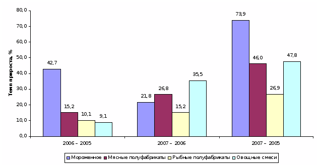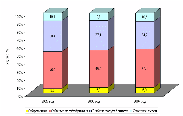 С структуре товарооборота компании не произошло значительных изменений, основную долю на протяжении всего анализируемого периода занимают мясные полуфабрикаты, доля товарооборота данного вида в 2005 году занимала 45,0%, а в 2007 году доля данной категории товара возросла до 47,8%.