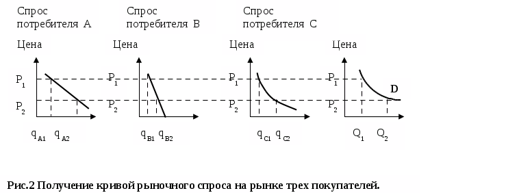 На рис.2 этот процесс представлен для экономики трех потребителей, причем как для каждого потребителя, так и для их суммы. По цене Р>1> потребитель А желает и способен приобрести количество q>A>>1> товара за период, потребитель В желает и способен купить q>В1 >товара за период, потребитель С желает и способен приобрести q> С1 >товара за период. Вместе они желают и способны приобрести q>A>>1+> q>В1+> q> С1>= Q>1 >единиц при цене Р>1>, что и показано на кривой рыночного спроса. Та же самая ситуация складывается и при цене Р>2>. Поскольку кривые индивидуального спроса понижаются вправо, постольку и кривая рыночного спроса должна понижаться вправо. Закон спроса действует не только по отношению к индивидуальному потребителю, но также по отношению ко всему рыночному спросу. Такое построение кривой рыночного спроса подразумевает, что каждый потребитель делает решение о покупке независимо от решения о покупке другого потребителя. Хотя можно с уверенностью сказать, что некоторые люди приобретают товар не столько для того, чтобы удовлетворить свои желания, сколько для того, чтобы произвести впечатление на других потребителей своим «показным потреблением», покупательские привычки некоторых индивидуумов находятся под влиянием структуры потребления лиц, с которыми они связаны или систематически общаются, некоторые потребители покупают товары для поддержки своего социального статуса. Следовательно, имеются случаи, когда количество товара, приобретаемого одним потребителем, влияет на количество этого товара, приобретаемое другим потребителем. В таких случаях, строго говоря, кривые индивидуального спроса находятся в зависимости друг от друга и для построения кривой рыночного спроса следует применять непростые процедуры сложения.
