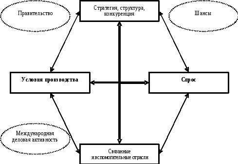 Подобный подход активно используется в экономически развитых странах (Финляндия, США и др.) с начала 90-х годов ХХ века. Он основывается на теории Майкла Портера, а точнее на так называемой модели «Даймонд» (рис.4). Многие оценки и прогнозы, сделанные рамках теории Портера, оказались пророческими, а промышленная политика, одной из основ которой наравне с построением национальной инновационной системы явился учет особой природы конкурентоспособных производств, принесла блестящие результаты. Так, например, в 2005 г. маленькая Финляндия удерживала 40% мирового рынка оборудования для производства целлюлозы и почти 30% рынка бумагоделательного оборудования. Доказав свою состоятельность к пониманию микро- и мезоэкономических процессов в жесткой конкурентной среде «ромб Портера» стал сначала базовым аналитическим инструментом чиновников и управленцев всех уровней в развитых странах, а затем с некоторыми оговорками был подхвачен отечественными управленцами.