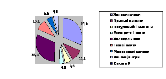 В рамках структури проданої великої побутової техніки зменшилася питома вага традиційної великої побутової техніки - холодильників, в то же час зросли частки - газових та електричних плит, посудомийних машин, пральних та сушильних машин, морозильних камер, великих кондиціонерів, що пов’язано з задоволенням споживачами іншого класу потреб.