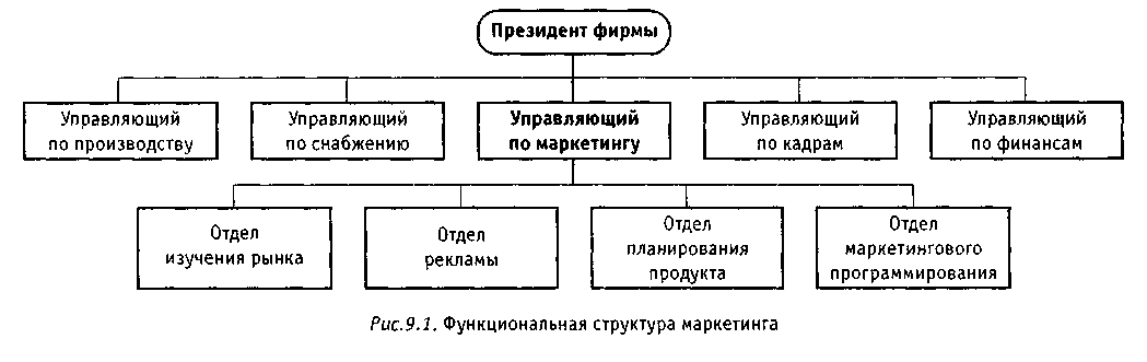 Функциональная организация маркетинга предполагает, что каждый отдел или сектор разрабатывает и осуществляет одну или ряд определенных функций маркетинговой деятельности. Такую структуру имеют в основном сравнительно небольшие фирмы, работающие с узким ассортиментом товаров и на ограниченном числе рынков или их сегментов. Главными недостатками такого типа маркетинговой структуры является замедленная реакция фирмы на изменение рыночных условий и требований покупателей, затруднительное решение вопросов финансирования маркетинговых мероприятий и т.д.