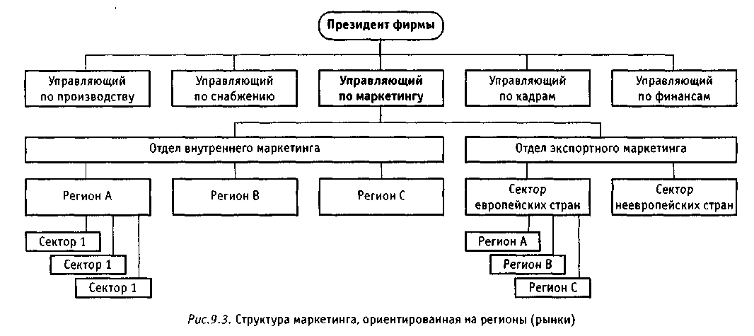 Региональная организация маркетинговых служб характерна для фирм, работающих на многочисленных и неоднородных рынках, имеющих четко очерченные границы. Такая структура эффективна, если товары фирмы пользуются спросом у стабильных групп населения и продаются через широкую сеть посредников, полностью охватывающих тот или иной регион. Недостатки данной структуры: децентрализация и дублирование некоторых функций маркетингового управления; ее низкая эффективность для фирм с широкой номенклатурой продукции.