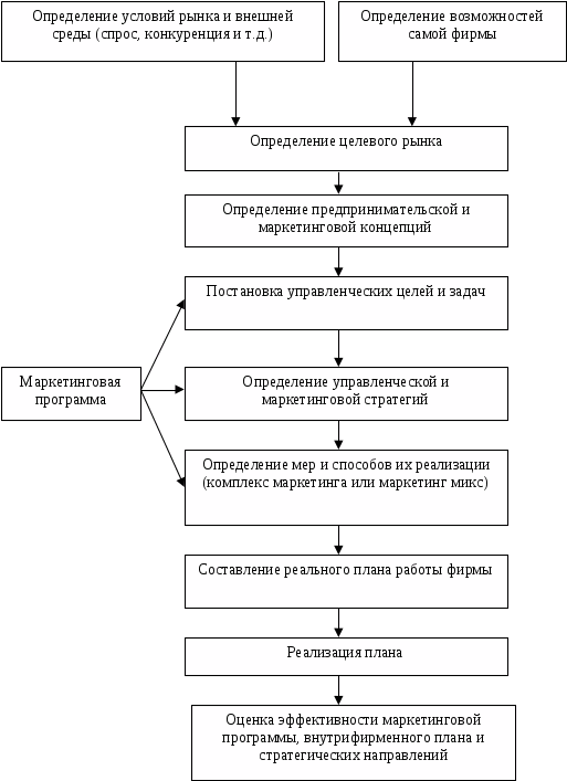 Маркетинговая программа составляется после завершения серьезного научно-практического исследования: анализа маркетинговой среды; комплексного изучения требований потребителей к товару; конъюнктуры рынка, его емкости и рыночного спроса; системы ценообразования, уровня и динамики цен, фирм-конкурентов, контрагентов и нейтралов; форм и методов сбыта; особенностей поведения покупателей и мотивов принятия ими решения о покупке, а также оценки производственно-ресурсных и сбытовых возможностей фирмы и определения уровня ее конкурентоспособности на различных рынках (или рыночных сегментах).