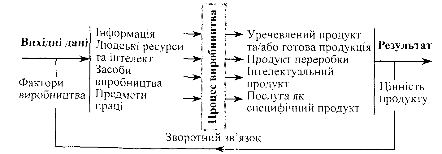 Процес — це цілеспрямована дія або група дій, які забезпечують результат. Сам процес та його здійснення залежать від вихідних даних, що впливають на результат продукування цінності (рис. 2). Результатом може бути: уречевлений продукт або/та готова продукція; інтелектуальний продукт; продукт переробки; послуга як специфічний продукт, цінність та вартість якого визначає попит у споживача. Вихідними даними, необхідними для здійснення процесу — факторами виробництва продукту — є інформація, людські ресурси та інтелект, засоби виробництва, предмети праці.