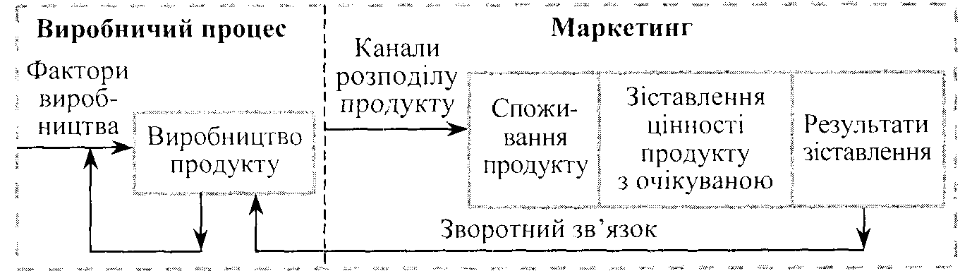 В умовах ринку та конкурентної боротьби якість продукції та її споживчі властивості визначають цінність продукту, у якій зацікавлений споживач, і тому саме він є головним арбітром в оцінюванні якості, зіставляючи фактично отриману цінність під час споживання продукту з очікуваною цінністю. Зверхність ролі споживача в оцінюванні якості продукту змушує виробника продукту використовувати набір засобів маркетингу — маркетинг-мікс, які піддаються його контролю, в намаганні викликати бажану реакцію-відповідь з боку споживача стосовно цінності продукту, і за отриманою реакцією споживача вдається до корегувальних заходів та поліпшення цінності продукту. Узагальнену інтерпретацію цього процесу для уречевленого продукту та віддільної у споживанні послуги від її виробництва наведено на рис. 3, з якого простежується наявність самостійних функцій у процесі виробництва і продажу товарного продукту: виробничої і маркетингової.