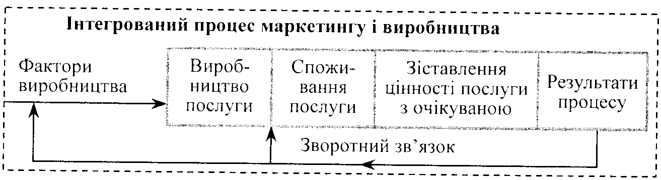 Процес виробництва і продажу послуг за характером істотно відрізняється від процесу виробництва і продажу товарного продукту, а відповідно і маркетингові та виробничі засоби щодо приведення результату процесу до задоволення потреб споживача також є відмінними від засобів товарного маркетингу. Характерні особливості послуг: невідчутність, швидкоплинність (неможливість зберігання), невіддільність від джерела виробництва та непостійність якості передбачає контакт з покупцем, участь покупця у процесі виробництва послуги та високу особисту оцінку виробника послуги і, відповідно, процес виробництва послуг є таким, у якому задіяні усі функції, пов'язані як з факторами виробництва, так і з маркетингом (рис.4), що потребують кооперування і координації для створення цінності та задоволення покупця.