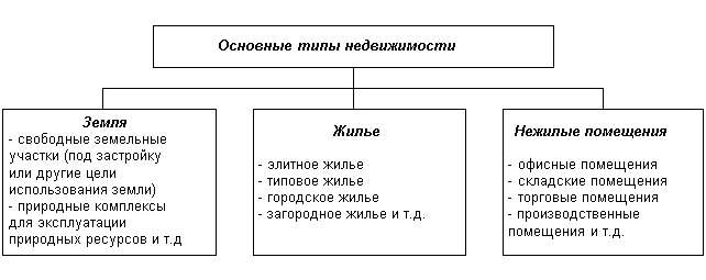 Недвижимость распадается на три основных типа: земля, жилье и нежилые помещения (Рис. 1.1.).