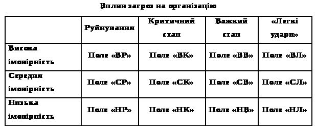 Ті загрози, які потрапляють на поля «ВР», «ВК», «СР», викликають дуже велику небезпеку для організації та потребують негайного та обов’язкового усунення. Загрози, що потрапили на поля «ВВ», «СК», «HP», також повинні знаходитися в полі зору вищого керівництва та бути усунутими в першочерговому порядку. Щодо загроз, які знаходяться на полях «НК», «СВ», «ВЛ», то тут потрібен уважний та відповідальний підхід щодо їх усунення.