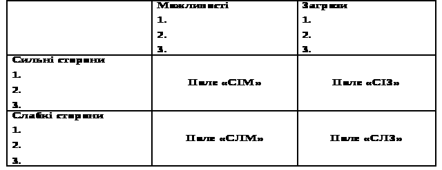 полі «СЛЗ» - організація повинна розробляти таку стратегію, яка дозволила б їй позбавитися від слабкості і спробувати запобігти загрозі.