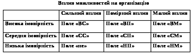 Отримані всередині матриці дев’ять полів можливостей мають різне значення для організації. Можливості, що потрапляють у поля «ВС», «ВП», «СС», мають велике значення для організації, і їх необхідно обов’язково використовувати. Можливості, що потрапляють у поля «CM», «НП», «НМ», практично не заслуговують уваги організації. Стосовно можливостей, які потрапили на інші поля, керівництво повинно прийняти позитивне рішення про їх використання, якщо в організації є достатньо ресурсів.