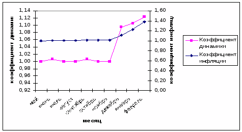 На графиках виден значительный рост инфляции за последнее время. Этот рост выпадает на период кризиса. По разным группам товаров, реализуемых в магазине, показатель инфляции за аналогичный период в 10 месяцев составляет в среднем 30%. При таком значительном росте цен за короткий период спрос снижается сам по себе (по закону равновесия спроса и предложения). В нынешних же условиях, когда на большинстве предприятий идут массовые увольнения работников, а на других - сокращение их рабочего дня и/или недели и, как следствие, заработной платы, спрос снижается еще больше.