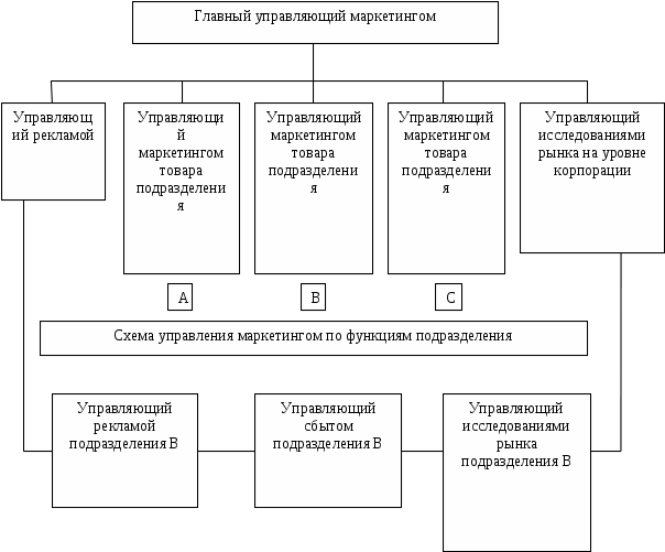 Во главе отдела маркетинга стоит, как правило, вице-президент фирмы. Организационно он подчиняется президенту и координирует работу по маркетингу в масштабе всей фирмы. Вице-президент является членом совета директоров и принимает участие в процессе принятия решений, выработке целевой ориентации деятельности фирмы, разработке долгосрочной стратегии, составление прогнозов и планов текущей деятельности фирмы. Непосредственно ему подчинены управляющие всех служб отдела маркетинга, которые работают под его наблюдением и контролем.