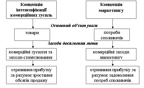 Рисунок 6. Сравнение концепции интенсификации комерческих усилий и концепции маркетинга.
