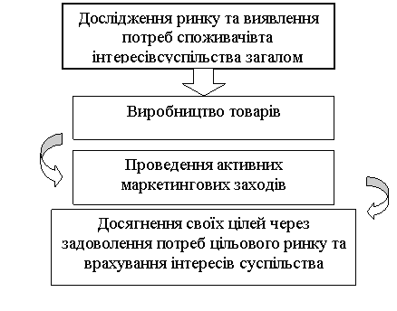 Концепция маркетингу предусматривает, что достижение целей предприятия,будут максимальными после того как определятся нужды потребителей и способы их удовлетворения на высоком уровне. На рисунці 5, наведено схему концепції маркетингу.