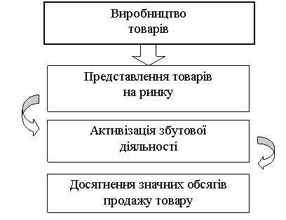 Концепция интенсификаци комерческих усилий говорит о том, что потребители не будут покупать товары предприятия в достаточном колличестве, если оно не сделает определённых усилий в сфере сбыта товаров. Этапы этой концепции показаны на рисунке 4.
