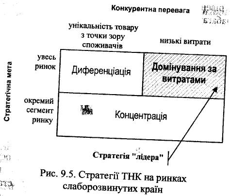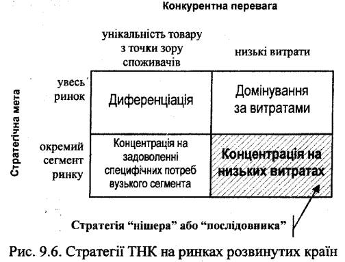 Використовуючи матрицю базових стратегій М. Портера, зобразимо з огляду обрання ТНКр відповідну конкурентну стратегію (рис. 9.6).