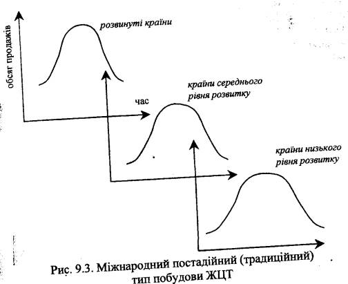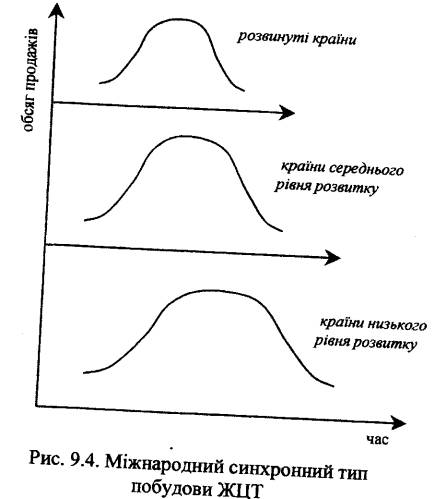 Обрання синхронного, послідовного чи випереджального типу побудови міжнародного ЖЦТ, знаходження на тій чи іншій стадії його еволюції передбачає істотні відмінності у здійсненні товарної, цінової, збутової та комунікаційної політики компанії (таблиця 9.2).