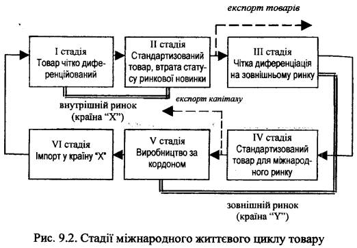 Існують певні відмінності у стадіях життєвого циклу товару (ЖЦТ) для внутрішніх і міжнародних ринків. Якщо на внутрішньому ринку товар традиційно проходить чотири стадії життєвого циклу (стадію проникнення товару на ринок, стадію зростання, стадію насичення і стадію спаду), то в міжнародному масштабі класичним є проходження шести стадій життєвого циклу (рис. 9.2).