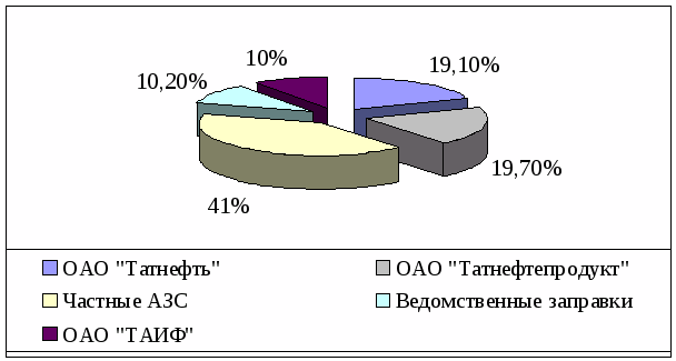 Необходимо отметить, что емкость татарстанского рынка бензина составляет 1,1 млн. тонн бензина и 1,2 млн. тонн дизельного топлива в год. Бензин в Татарстан поставляется из Уфы, Самары и Перми. Крупнейшими топливными операторами являются ОАО «Татнефть» (153 АЗС, 19,1% рынка) и ОАО «Татнефтепродукт» (159 АЗС, 19,7% рынка). 41% рынка приходится на частные АЗС (356 шт.), чуть более 20% рынка занимают ведомственные заправки (рис. 1.1.) [6].