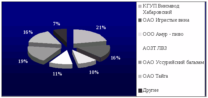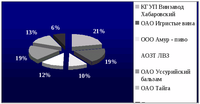 На рынке г. Хабаровска действует 6 крупных компаний, занимающихся оптовой реализацией алкогольной продукции: ОАО Тайга; КГУП Винзавод Хабаровский; ОАО Игристые вина; АОЗТ Ликеро – водочный завод; ОАО Амур – пиво; ООО Уссурийский бальзам.