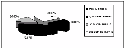 Среди других вопросов, у респондентов спрашивалось о степени важности наличия в кафе зала для курящих. В результате для 41,67% (10) респондентов наличие зала для курящих довольно важно, а для 20,83% (5) – очень важно. В сявзи с этим, появилась необходимость оборудовать в кафе специальный зал для курящих. Диаграмма степени важности наличия в кафе зала для курящих представлена на Рисунке 8.