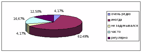 В ходе исследования было выявлено, что 62,5% респондентов иногда посещают кафе «STEAK», 16,67% - часто, 12,5% - регулярно и по 4,17% приходится на тех респондентов, которые очень редко посящают кафе, либо не задумывались над этим вопросом. Регулярность посещения кафе «STEAK» отображена графически на Рисунке 1.