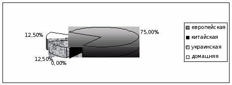 Проведенное исследование позволило установить, какую кухню предпочитают посетители кафе. Было установлено, что 75% респондентов предпочитают европейскую кухню, по 12,5% предпочтений приходится на украинскую и домашнюю кухню. Диаграмма результатов опроса респондентов представлена на Рисунке 2.