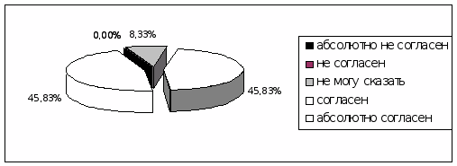Установлено, что 45,83% респондентов абсолютно согласны с утверждением, что высокая цена должна соответствовать высокому качеству товара, 45,83% респондентов - согласны, 8,33% респондентов – затруднились ответить.