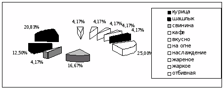 Что касается слова «мясо», здесь возникли следующие ассоциации: шашлык (25% (6)), на огне (20,83% (5)), свинина (16,67% (4)), вкусно (12,5% (3)), а также – курица, кафе, наслаждение, жареное, жаркое, отбивная (по 4,17% (1)). Диаграмма ассоциаций со словом «мясо» представлена на Рисунке 7.