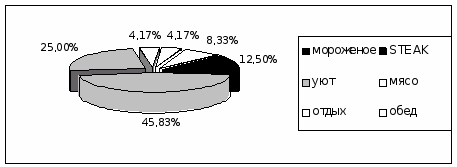Респондентам предлагалось назвать словесную асоциацию на слова «кафе» и «мясо». На слово «кафе» наибольшее число респондентов - 45,83% (11) высказали ассоциацию «STEAK», что говорит о широкой популярности данного кафе, 25% (6) респондентов «кафе» ассоциируют с уютом, 12,5% (3) – с мороженым, 8,33% (2) – с обедом, и наименьшее количество респондентов – по 4,17% (1) – с мясом и с отдыхом. Диаграмма ассоциаций со словом «кафе» представлена на Рисунке 6.