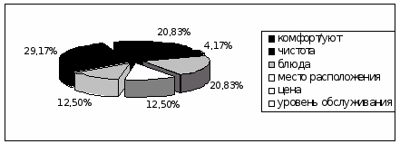 Установлено, что 29,17% (7) респондентов при выборе кафе руководствуются его уровнем обслуживания, для 20,83% (5) респондентов самое главное – вкусные блюда, такое же количество респондентов приоритетным для себя считает уют/комфорт кафе, по 12,5% (3) респондентов самым главным считают цену и место расположения кафе, и наименьшее количество респондентов – 4,17% (1) уделяют внимание чистоте.