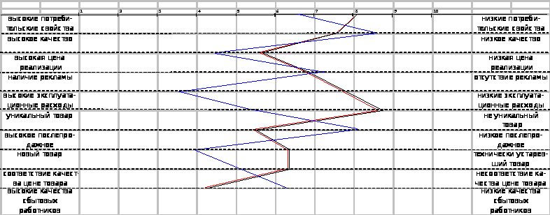 1) на основании исходных данных, представленных в таблице №1 графически отразить профиль товара по отношению к идеальному варианту и товару-конкуренту, используя метод семантического дифференциала;