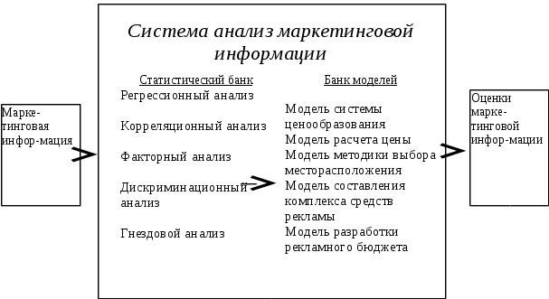 Система анализа маркетинговой информации - набор совершенных методов анализа маркетинговых данных и проблем маркетинга. Однако ряд фирм считает подобный подход либо чересчур техническим, либо чересчур академическим. Основу любой системы анализа маркетинговой информации составляют статистический банк и банк моделей. Статистический банк - совокупность современных методик статистической обработки информации, позволяющих наиболее полно вскрыть взаимосвязи в рамках подборки данных и установить степень их статистической надежности. Эти методики позволяют руководству получать ответы на вопросы типа: