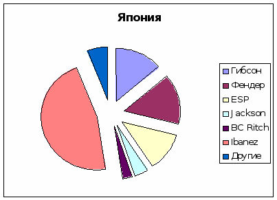 Как видно из графика, лидирующей маркой на Японском рынке является Ibanez, ценовая категория которого от 150дол до 300 (индонезийское и китайское производство) и от 400 дол (японское производство). Как и в США, в так и в Японии все гитары по ценовой категории доступны для потребителя.