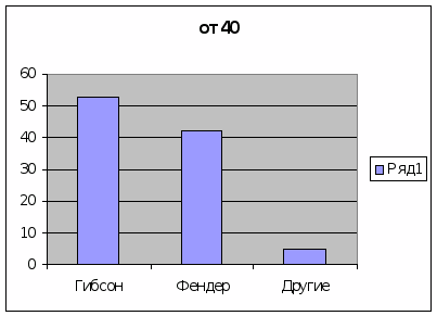 Из графика видно что как Гибсон, так и Фендер пользуются популярностью среди молодежи. Это можно объяснить доступной ценой и большим количеством профессиональных музыкантов, являющихся кумирами молодой аудитории, выбравших данный инструмент из-за превосходного звучания.