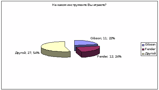 Среди этих людей было 22 студента (44% опрашиваемых), 7 служащих (14%), 18 человек рабочих специальностей (36%), 3 пенсионера (6%). По данным анкетирования было выявлено, что 24% опрошенных предпочитают гитару марки Fender (12 человек из 50), 22% - Gibson (11 человек), 54% - это все остальные марки вместе взятые (27 человек), (см. рис.1).