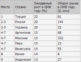Это также приводит к искажению официальных данных, касающихся общемировых затрат на проведение маркетинговых исследований, так как они не учитывают расходы фирм, осуществляющих изучение рынков своими силами. Учитывая эти погрешности все же можно дать общую картину, по данным отчета Европейского общества исследователей рынка и общественного мнения (ESOMAR), посвященного состоянию мирового рынка маркетинговых исследований в 2005 году. ESOMAR оценила объемы рынка: где по темпам роста лидирует Турция (22%), но по обороту рынка лидирует Мексика – 332 млн. долл.