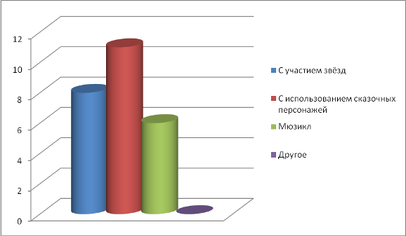 Исходя из диаграммы можно сказать, что большей популярностью пользуется реклама с использованием сказочных персонажей – 11 человек, 8 человек считают, что с участием звёзд, а 6 человек, что мюзикл.