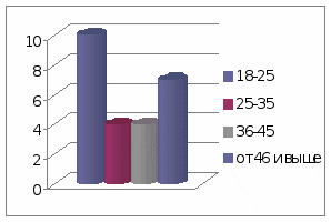 Исходя из диаграммы можно сказать, что больше всех опросили лиц с возрастом от 18–25 – 10 человек, лиц от 46 и выше – 7 человек, а людей с возрастом от 36–45 и 26–35 одинаково по 4 человека.