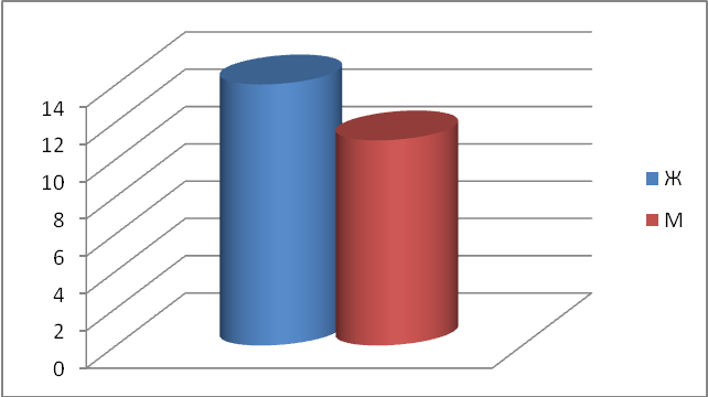 Исходя из диаграммы можно сказать, что больше опросили лица женского пола – 14 человек, а лиц мужского пола составили 11 человек.