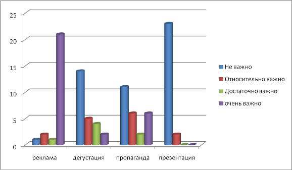 Исходя из диаграммы можно сказать, что больше предпочтения респонденты отдали рекламе – 80,6%, пропаганде – 12,4%, дегустации – 7%, а презентации респонденты не дали ни одного процента.