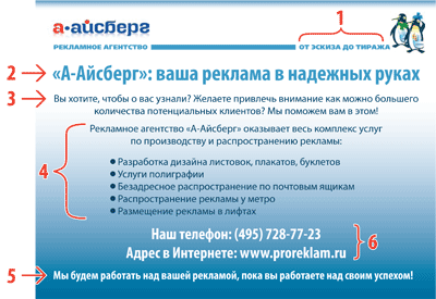 Рассмотрим эти элементы по очереди. Для наглядности мы приводим пример рекламного обращения агентства «А-Айсберг» - рис. 1. Все ключевые части отмечены цифрами.
