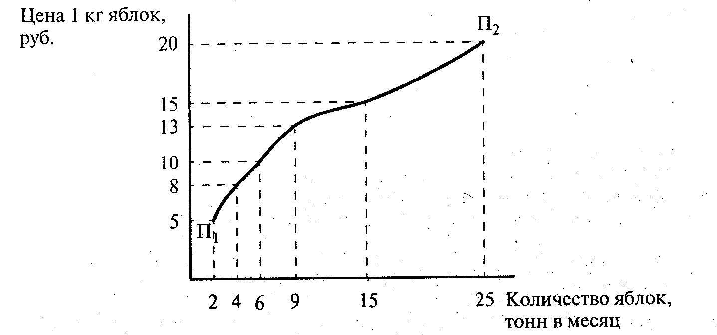 Данная взаимосвязь наглядно представлена на графике (рис. 2). Ее иллюстрирует опять же пример с продажей яблок. По оси ординат отложены цены на яблоки, а по оси абсцисс - количество яблок, которое продавцы готовы продать. Кривая П>1>-П>2 >на графике показывает, как с ростом цены производители увеличивают объем продажи, и, наоборот, предложение с их стороны уменьшается при снижении цены.