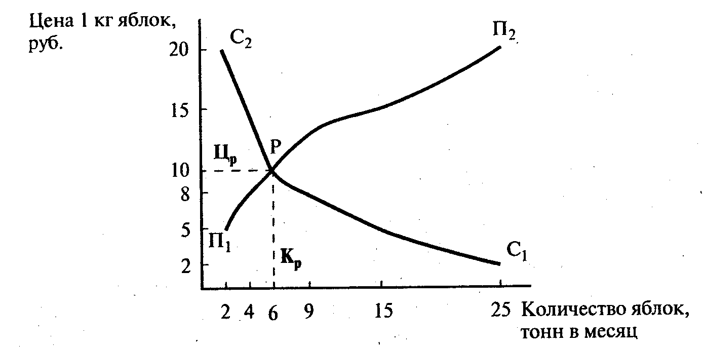 Если из точки Р опустить перпендикуляр на ось абсцисс, то в точке Кр определим равновесное количество. Оно показывает величину товарной массы (в данном случае количество яблок), которая удовлетворяет пожелание покупателей и продавцов.