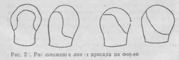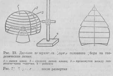 Деление поверхности формы головного убора на геодезические линии приведено на рис.3. Измерив длину линий между швами и зная расстояние между линиями, их последовательно переносят на плоский чертеж, в результате чего получается лекало.