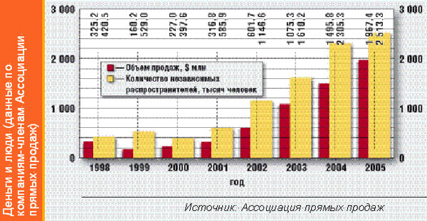 Возникнув сравнительно недавно, многоуровневый маркетинг на удивление быстро развивался. Компании с многоуровневой системой маркетинга, которых сейчас в мире насчитывается несколько тысяч, по разным оценкам, достигли суммарного оборота свыше 100 млрд. долларов в год. Многоуровневый маркетинг легализован в США, Канаде, Великобритании, Австралии, Германии, Японии, Малайзии и других странах мира. Приспособление к сети Интернет сделало этот бизнес еще более эффективным По данным Ассоциации прямых продаж России совокупный объем продаж ее членов, компаний многоуровневого маркетинга возрос с 1998 по 2005 год на 1642 млн. долларов США (рисунок 2). Соответственно растет число дистрибьюторов.