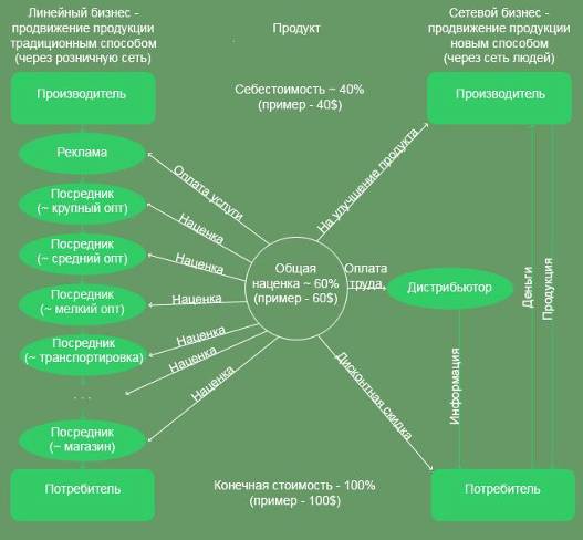 Рисунок 1. Схема многоуровневого маркетинга в сравнении с линейным бизнесом